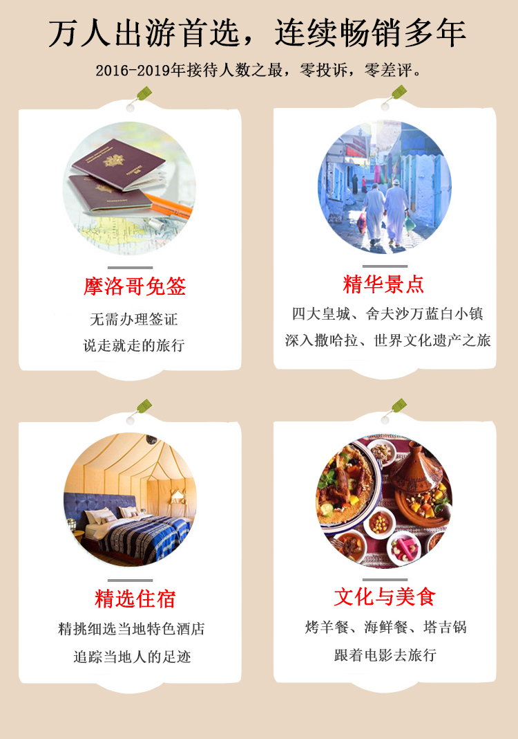 2.摩洛哥從 2016 年 6 月 1 日起對中國公民普通因私護照實行免簽政策,請確保您護照上有 2 頁以上空白頁以便蓋章和無其他國家不良出入境記錄。
