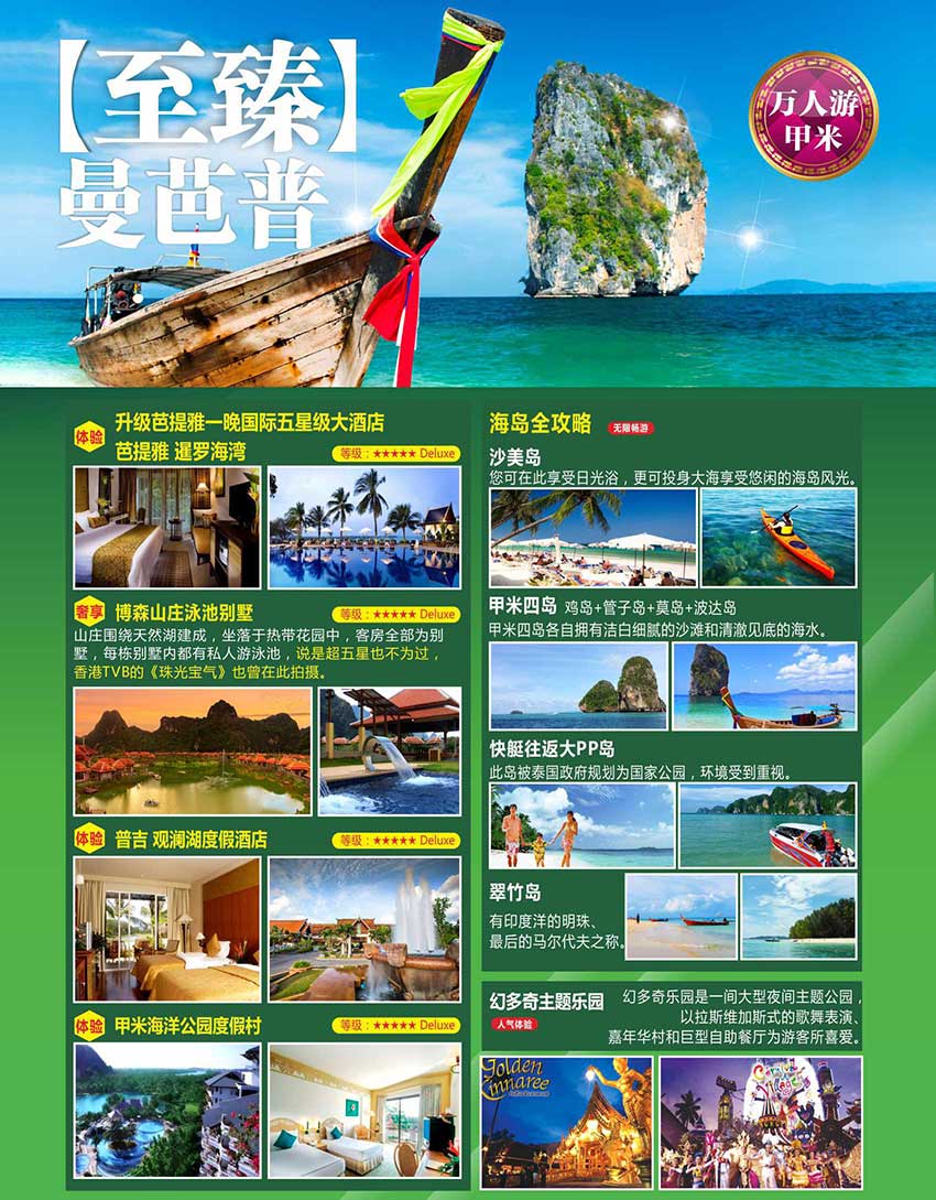 早餐后前往甲米寬闊的碼頭,從甲米出海前往著名的大PP島有兩大優(yōu)點(diǎn),第一:甲米是歐美游客的最愛,不會出現(xiàn)像在普吉島碼頭眾多中國游客擁擠排隊等船的局面。第二:從甲米往返大PP島要比從普吉往返大PP島少10海里,使游客在出海的旅途中更加舒適。首先搭乘快艇前往著名的甲米四島【雞島Chicken island】+【管子島Tube island】+【莫島Moh island】+【波達(dá)島Poda island】,因電影【割喉島】在此拍攝而聞名于世。甲米四島各自都擁有潔白細(xì)膩的沙灘。甲米四島的海水清澈透底。您可在出海游玩后將大PP島和小PP島海域與甲米四島海域的清澈度、美麗度一比高低,其中【雞島Chicken island】+【管子島Tube island】+【莫島Moh island】三島通過細(xì)膩白沙相連接,形成了浪漫的寬闊白色沙路,浪漫的白色沙路每天只有幾個小時的機(jī)可以看到,其他時間都被漲潮的海水淹沒,您可在浪漫白沙上自由自在通行于三島?!静ㄟ_(dá)島Poda island】無法上島,我們通過快艇欣賞此島,之后我們搭乘【快艇前往大PP島】,此島被泰國政府規(guī)劃為國家公園,環(huán)境受到重視。搭乘快艇來到【小PP島環(huán)游】,隨后我們將前往有印度洋的明珠、最后的馬爾代夫之稱的【翠竹島】(約1.5小時),你可以看到最真實(shí)的藍(lán)天、最清澈的海水、最純粹的陽光、最晶瑩的沙灘。途中在最火紅的【大堡礁】浮潛(不低于30分鐘)(浮潛所用的工具就在放在船上,用具請別掉進(jìn)大海里去了,是要賠錢的),這里可以探索印度洋安達(dá)曼奇妙的海底世界,此處是零污染,在此你可以浮潛看海底世界。當(dāng)你將手中的面包投入這片清澈透底的海中,這里會突然出現(xiàn)上千條各個種類的熱帶魚來享用您的面包美餐,您更可以馬上穿上救生衣、帶上我們?yōu)槟鷾?zhǔn)備的蛙鏡掉入海中與熱帶魚共舞,此刻的場景,仿佛您跳入了魚塘中。出海游玩后我們搭乘快艇返回碼頭。