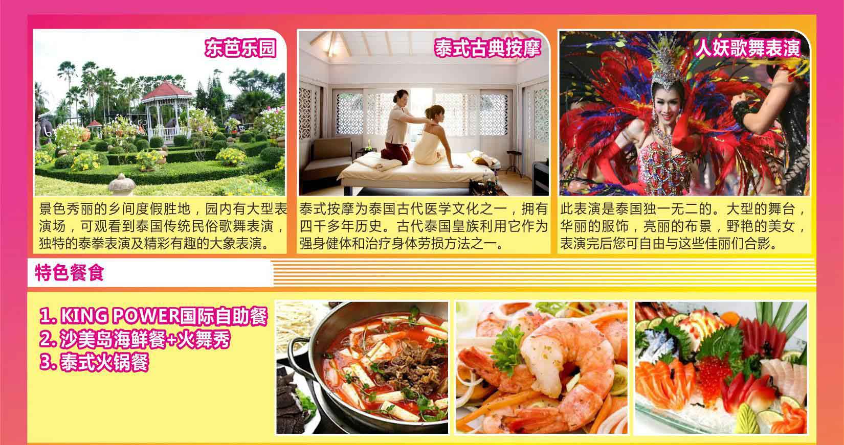 早餐后將參觀【泰國風(fēng)情園】(約45分鐘)是目前最具人氣的景點(diǎn),含有民族特色及南洋風(fēng)情自然與人文的雙重景觀:您可以親身體會(huì)深體會(huì)古代暹羅人民的潑水節(jié)氣氛。后前往【東芭樂園】(約90分鐘),此為景色秀麗的鄉(xiāng)間度假勝地,園內(nèi)有大型表演場,可觀看到泰國傳統(tǒng)民俗歌舞表演,獨(dú)特的泰拳表演及精彩有趣的大象(跳舞、作畫、踢足球)表演。午餐后前往國家海洋公園【沙美島】展開我們的精彩的沙美島風(fēng)情游。抵達(dá)沙美島后,您可在此享受日光浴更可投身大海享受悠閑的海島風(fēng)光,放松自我、盡享這世外桃源帶給您的溫馨假期。晚上在沙美島上享用海鮮餐并觀看火舞秀。