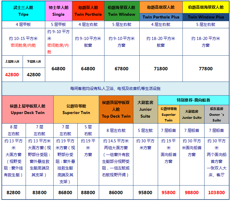 (1)船票包含:不同艙位一個(gè)床位、早午晚餐、24小時(shí)茶和咖啡自助式供應(yīng)